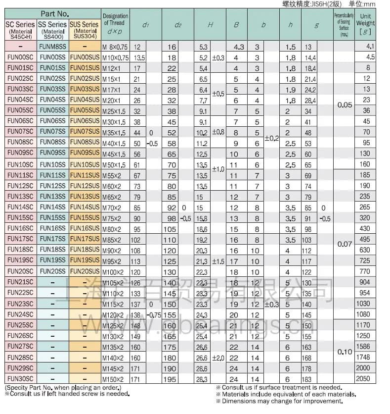 | 尺寸 | M 8~M100 (SS系列) M10~M150(SC系列) M10~M100(SUS系列) ※螺距:精密螺紋 |