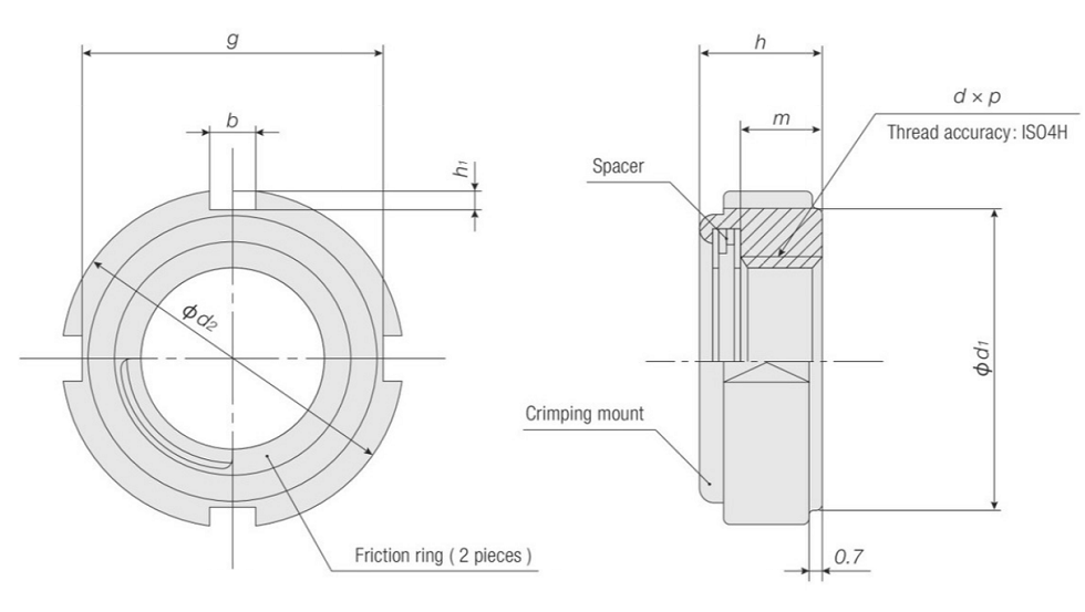 | 品號(hào) | d×p | 座面直徑 (φd1) | 外徑 (φd2) | 全高 (h) | 螺紋高度 (m) 約 | 槽寬 (b) | 槽深 (h1) | 槽對(duì)邊 (g) | 螺栓余長(zhǎng) ?min | 單重 (g) 約 | 容許軸向 靜載荷 (kN) | |||||