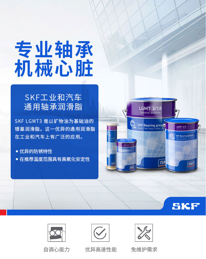 SKF工業(yè)和汽車通用軸承潤(rùn)滑脂 SKF LGMT3是以礦物油為基礎(chǔ)油的鋰基潤(rùn)滑脂。這一優(yōu)異的通用潤(rùn)滑脂在工業(yè)和汽車上有廣泛的應(yīng)用。
