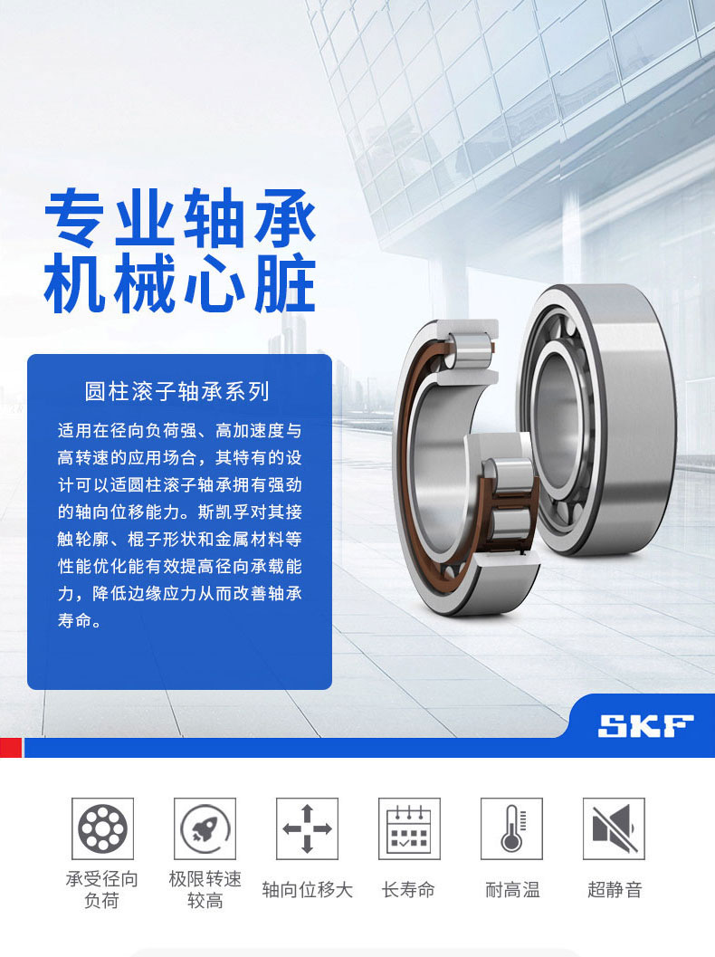 圓柱滾子與滾道為線接觸軸承。負(fù)荷能力大,主要承受徑向負(fù)荷。滾動體與套圈擋邊摩擦小,適于高速旋轉(zhuǎn)。根據(jù)套圈有無擋邊,可以分有NU、NJ、NUP、N、NF等單列圓柱滾子軸承,及NNU、NN等雙列圓柱滾子軸承。該軸承是內(nèi)圈、外圈可分離的結(jié)構(gòu)。