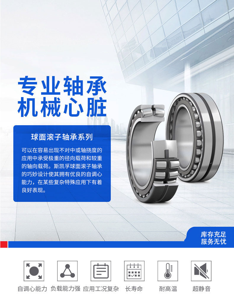 調(diào)心滾子軸承具有兩列滾子,一個(gè)共同的帶球面外圈滾道和內(nèi)圈滾道在軸承軸線成一角度傾斜。在外圈的滾道中的球體的中心點(diǎn)是在軸承軸線。調(diào)心滾子軸承設(shè)計(jì)用于承受重徑向載荷,以及在兩個(gè)方向的軸向載荷重。